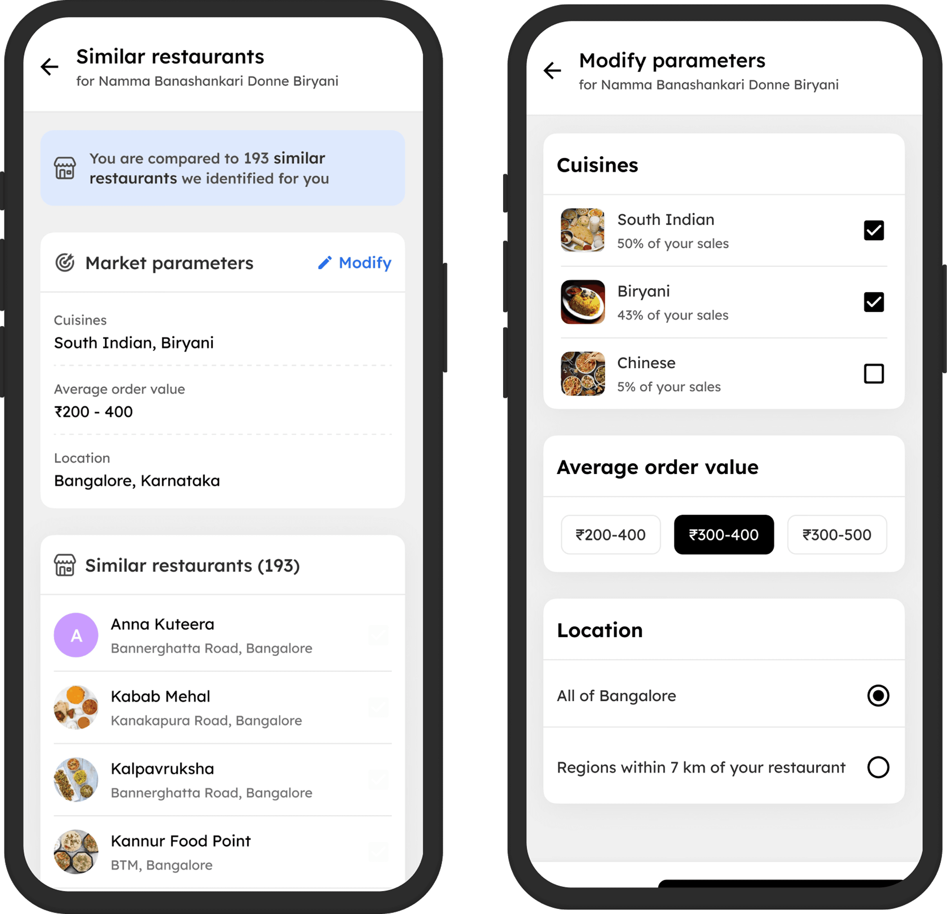 Make the competitor set transparent and editable. Use filters like cuisine, AOV, and delivery zone to auto-select peers, while giving RPs the power to adjust this set as their business evolves.